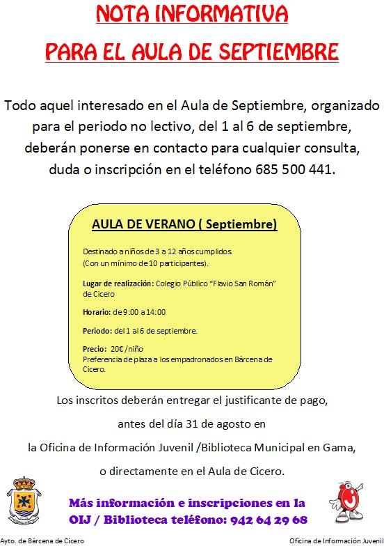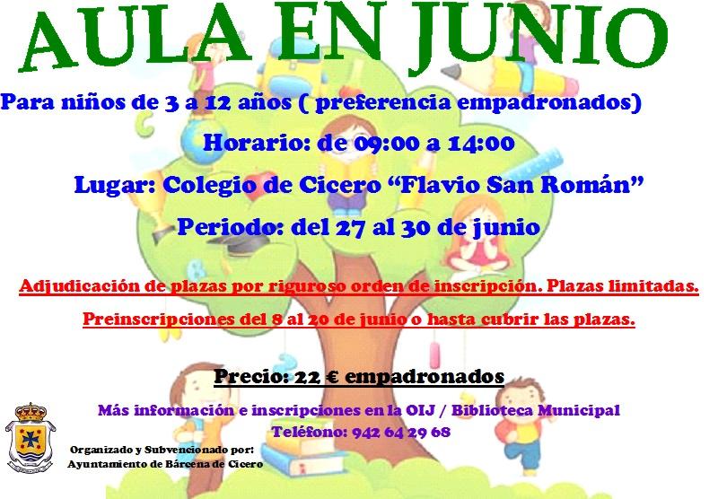 Desde el Ayuntamiento de Bárcena de Cicero coordinado desde la Oficina de Información Juvenil, se realizará como años anteriores, el Aula para la última semana del mes de Junio, ya que es periodo no lectivo, del 27 al 30.