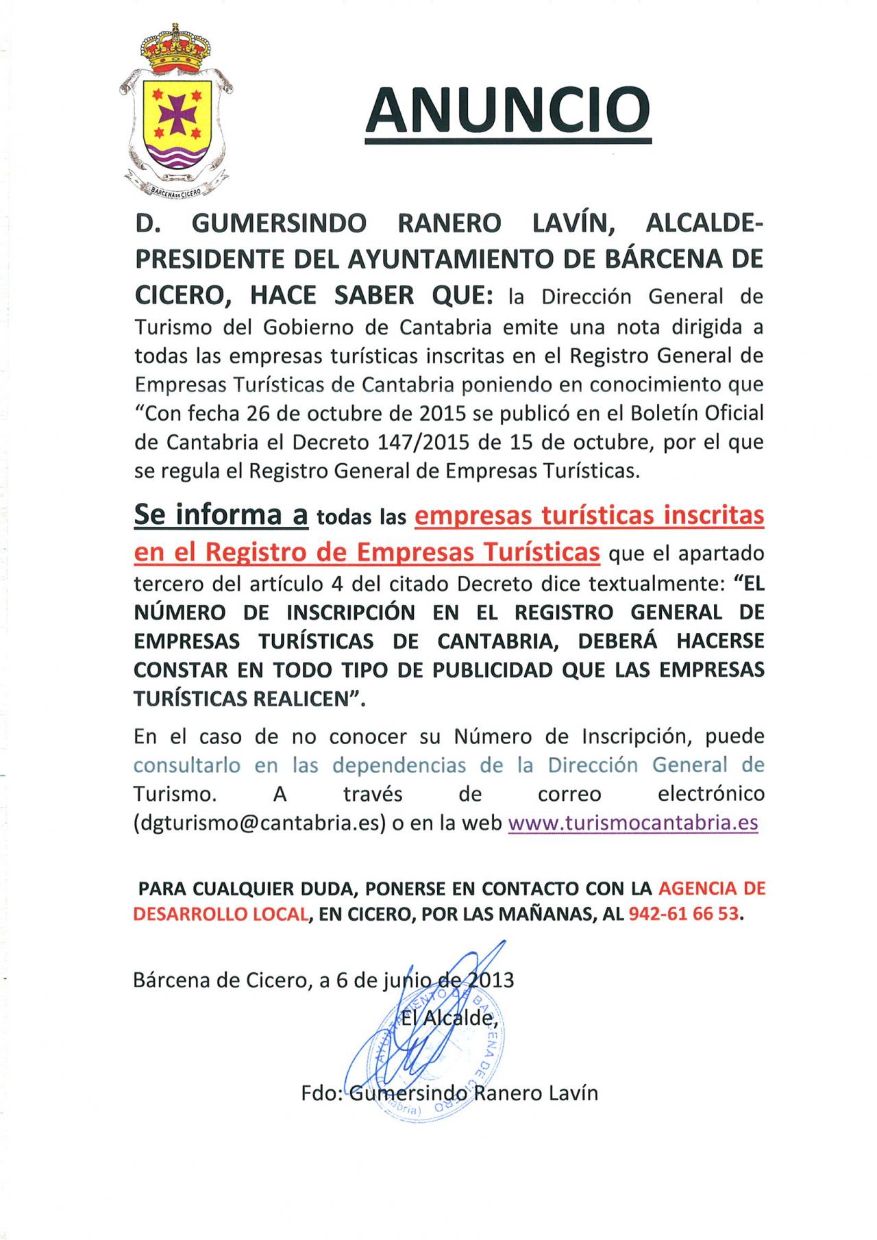 la Dirección General de Turismo del Gobierno de Cantabria emite una nota dirigida a todas las empresas turísticas inscritas en el Registro General de Empresas Turísticas de Cantabria poniendo en conocimiento que “Con fecha 26 de octubre de 2015 se publicó en el Bole ...